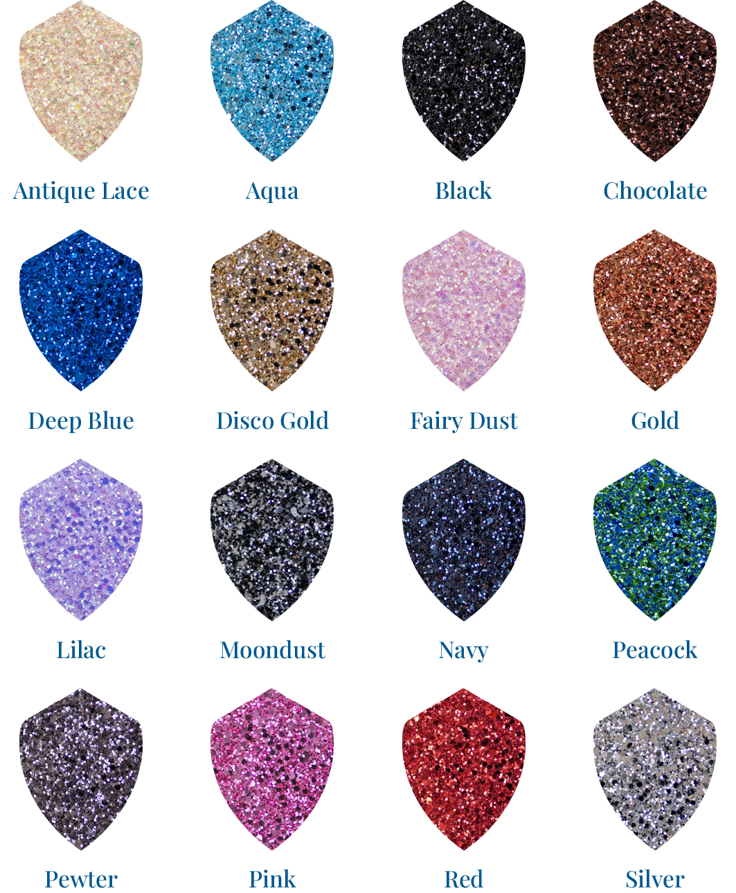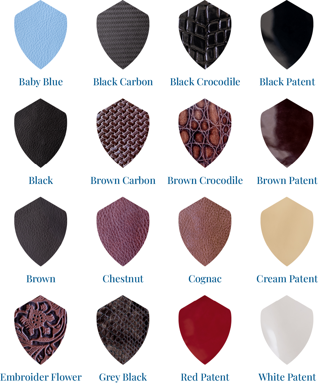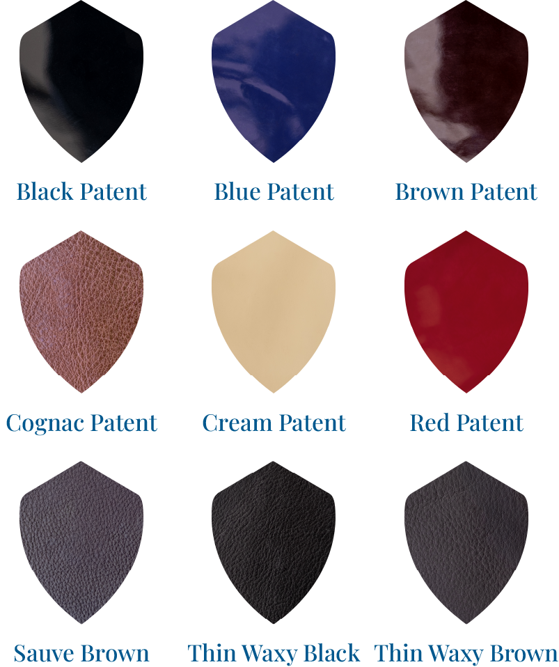 Available in black and brown and nutmeg. Buffalo leather can also be used along with glitter and different leathers.